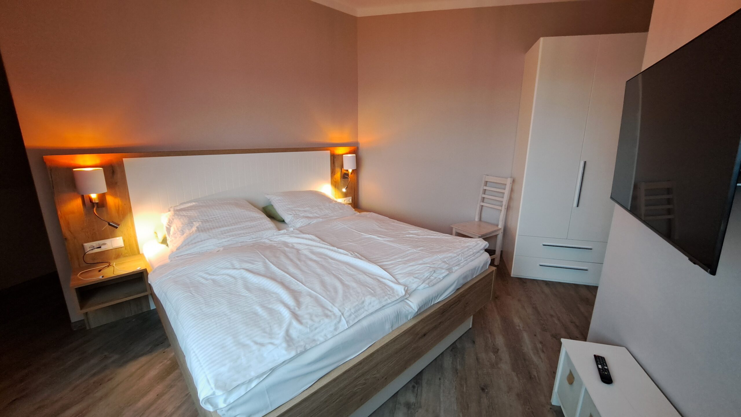 Schlafzimmer mit Doppelbett und Flat TV, Betten in 2,00 x 1,80 Meter, Schlafzimmerschrank